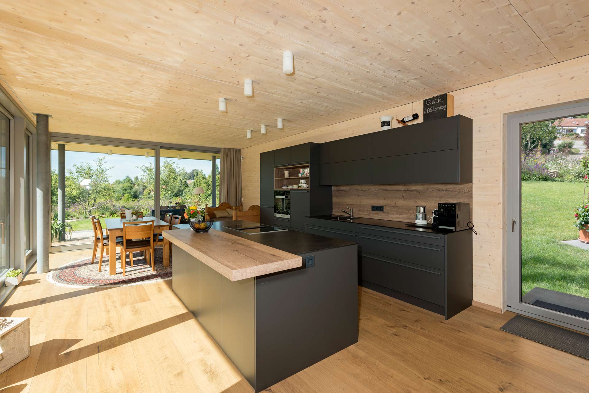 Das Einfamilienhaus in Brettsperrholzelement-Bauweise mit einer Wohnfläche von ca. 185 m² produziert mehr Energie als es selbst benötigt und überzeugt durch seine ansprechende Architektur in Kombination mit modernster Holzbautechnik.
