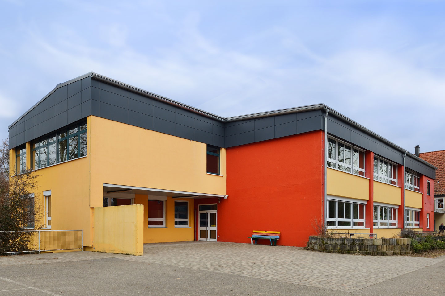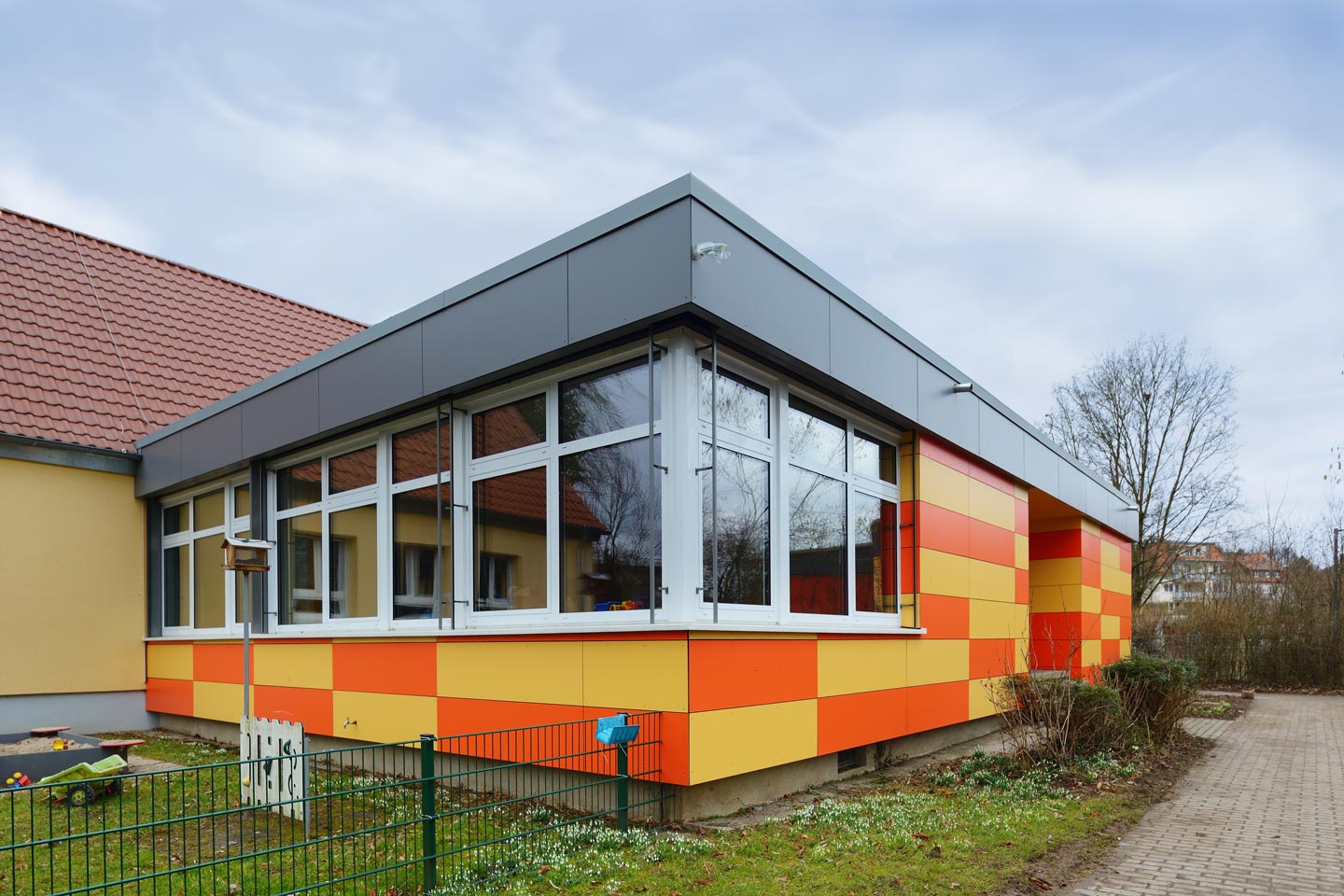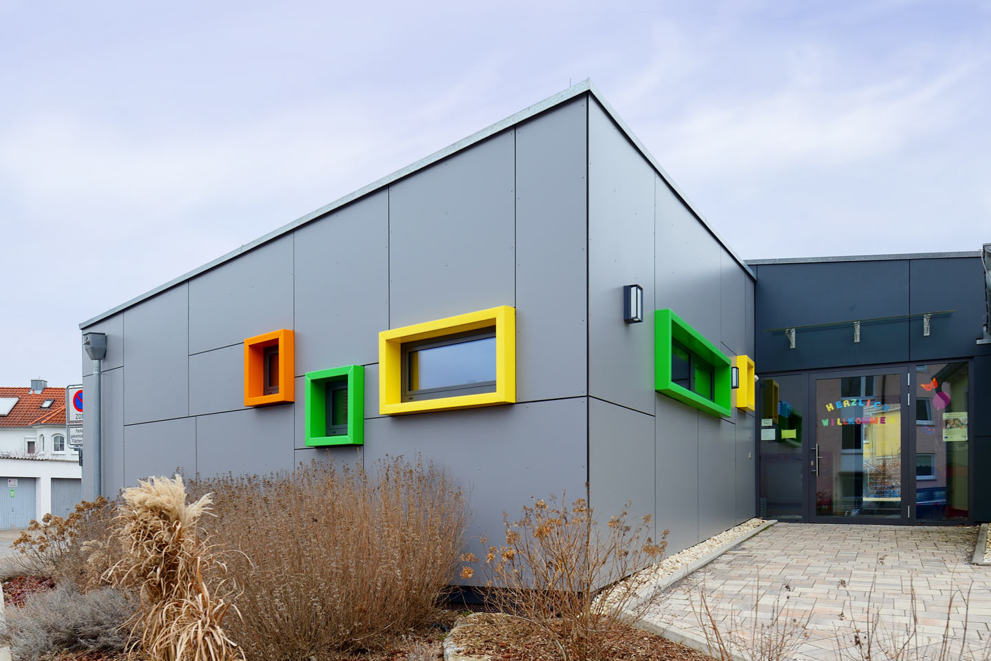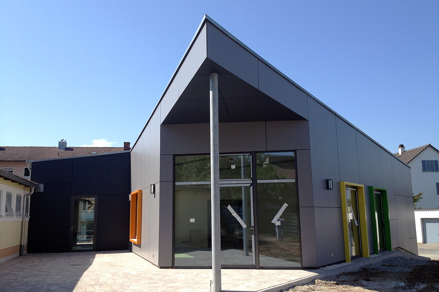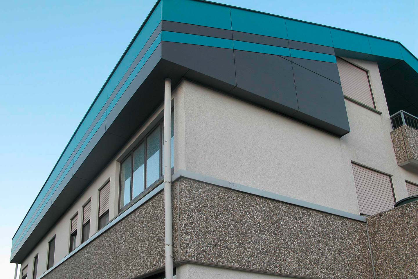 bestehendes Flachdach wurde durch ein Satteldach ersetzt, Gestaltung der Fassade mit großformatigen Fassadenplatten