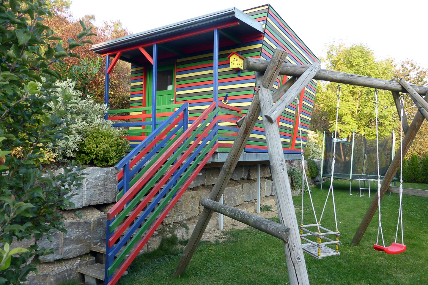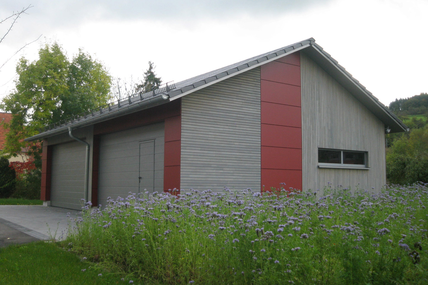 erstellt in Holzrahmenbauweise, Gestaltung der Fassade großformatigen Fassadenplatten und Leisten-Schalung